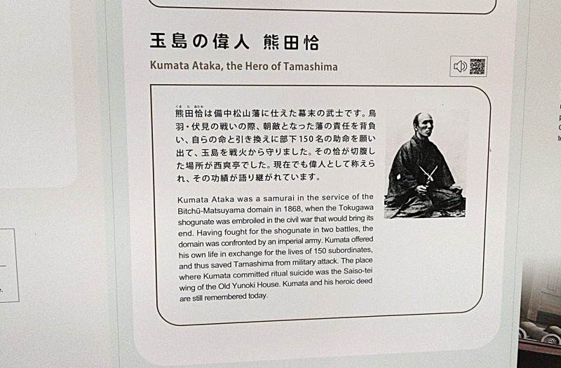 「次の間」には、幕末の動乱で、備中松山藩士・熊田恰(くまた あたか)が自害と引き換えに、玉島を戦禍に巻きこまれることから救ったというエピソードが残されています。