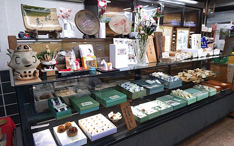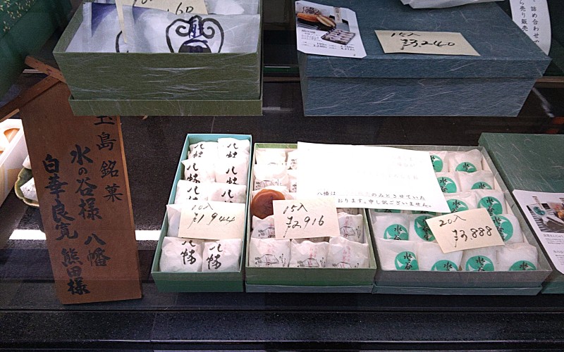 看板商品の玉島銘菓。左から順に、地元の地名にちなんだ「八幡」、玉島ゆかりの良寛さんより名前を頂いた「白華良寛」、備中松山城主・水谷勝隆公にちなんだ「水の谷さま」。