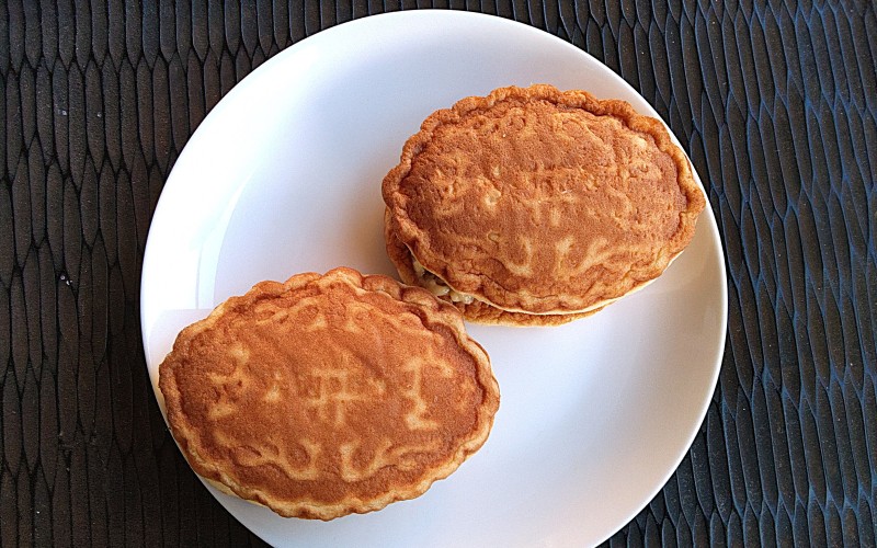 店名が入った大人気のワッフル。注文を受けてから一つずつカスタードクリームを入れてくれるので出来立ての味が楽しめます。