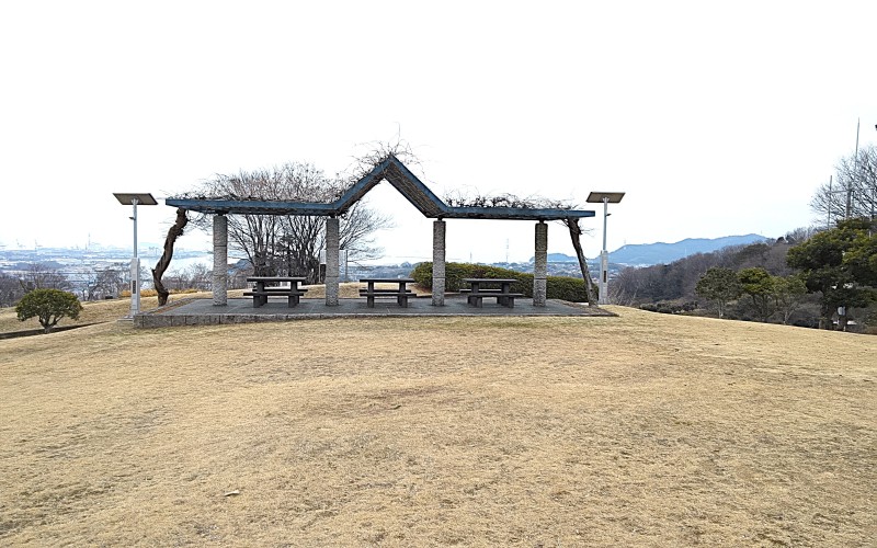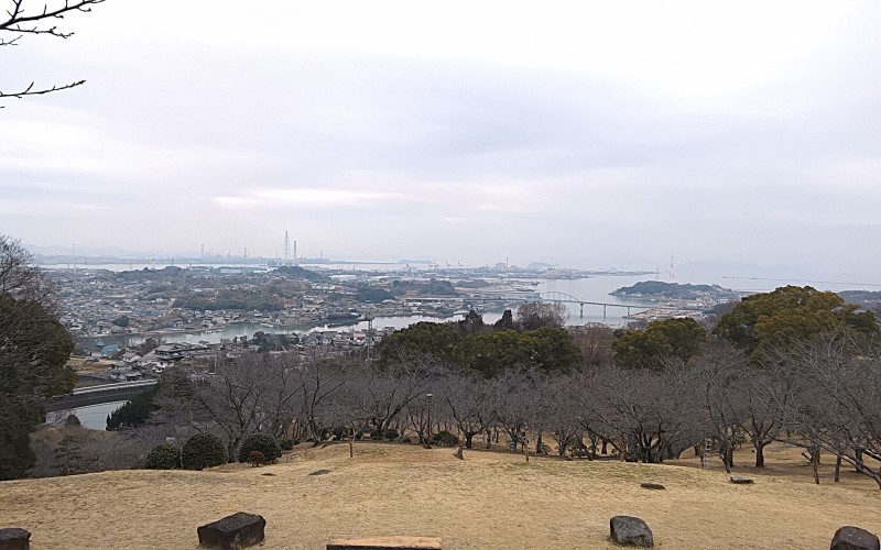 山全体が公園となっている山頂には芝生広場や休憩所があり、玉島港や玉島大橋、瀬戸内海を望む眺望は見事です。