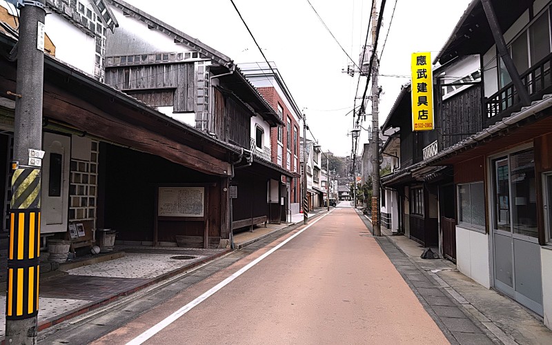 新町の町並み保存地区。干拓時に作られた潮止め堤防の上に築かれたかつての問屋街。最盛期の元禄年間には40件以上の回船問屋と200を超える蔵が立ち並び、活気に溢れていました。